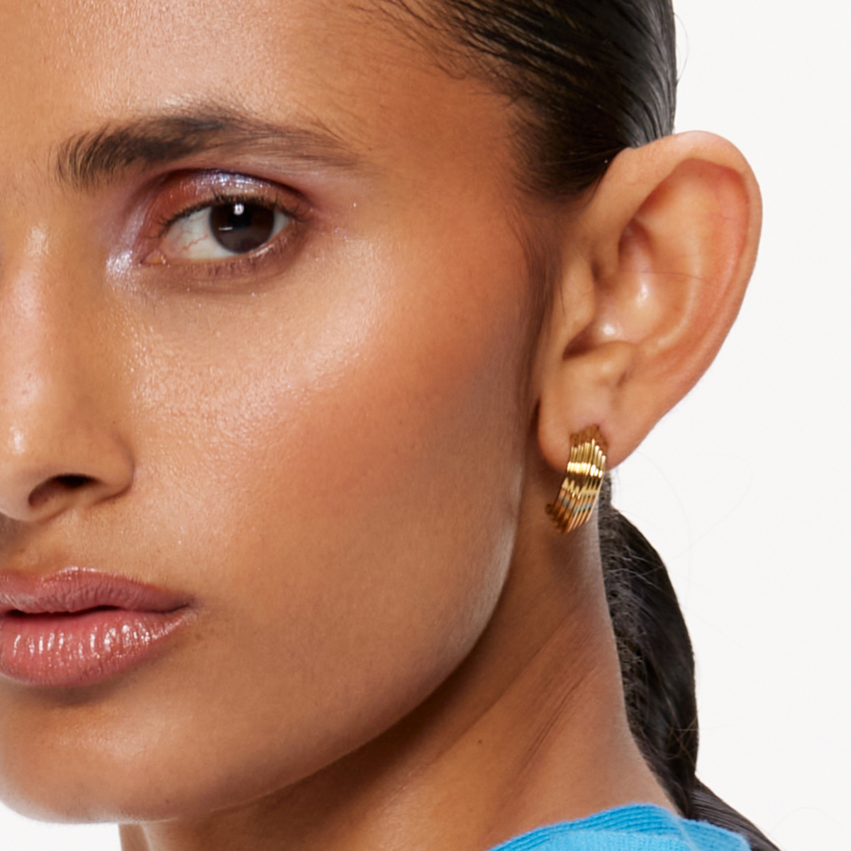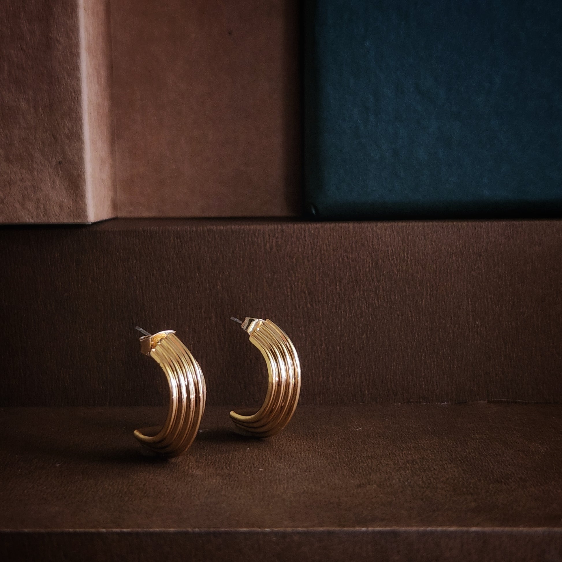 C-shaped half hoop studs with stepped metal detail. Handcrafted in Brass with 18k Gold plating.