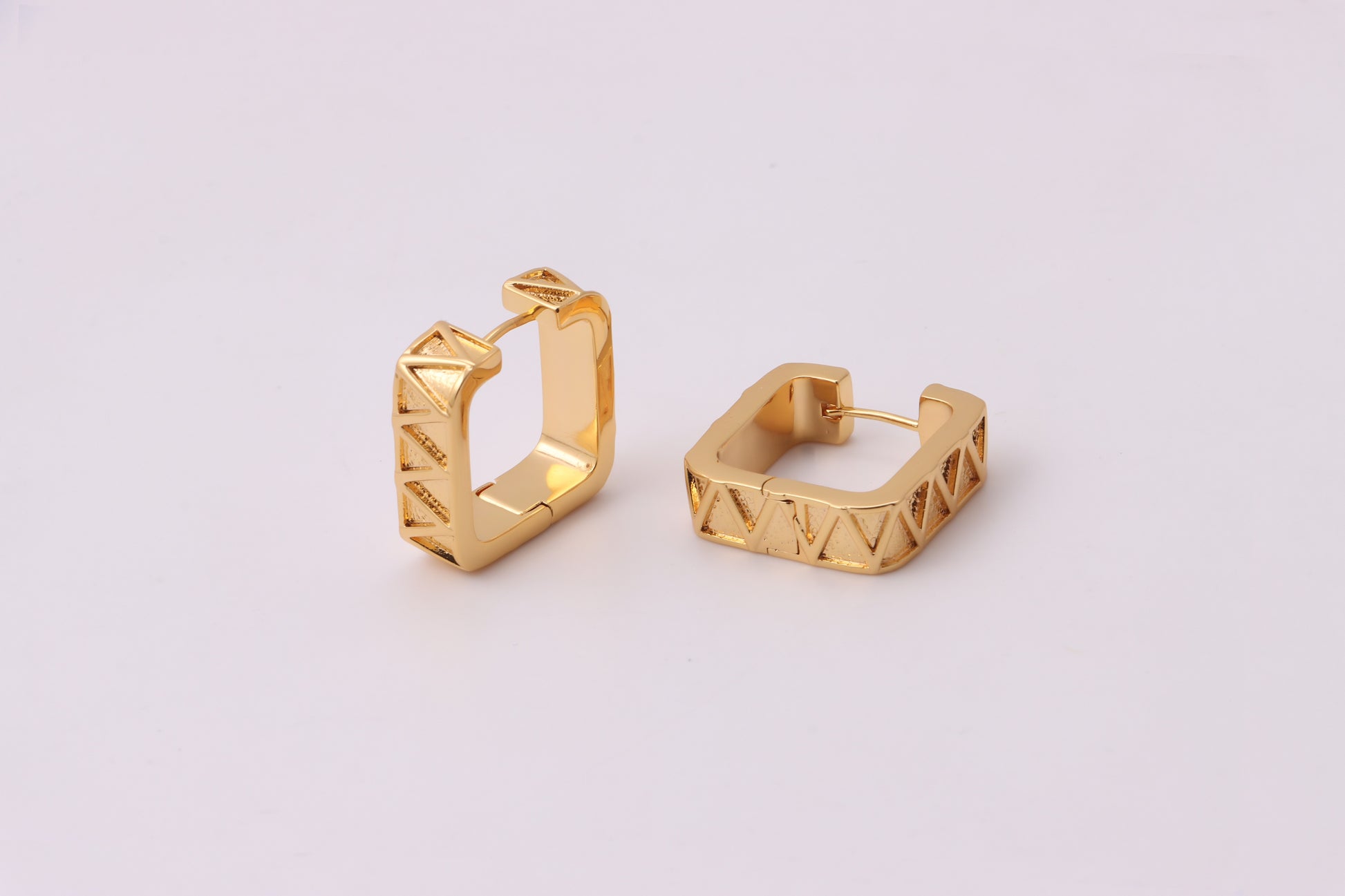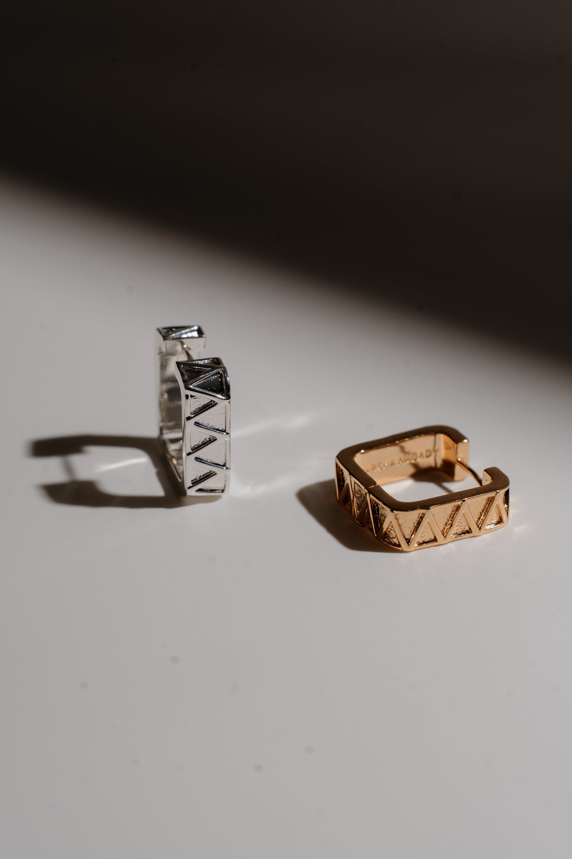 Rounded square hoops with triangle detail. Handcrafted in Brass with 18k gold plating and rhodium plating.