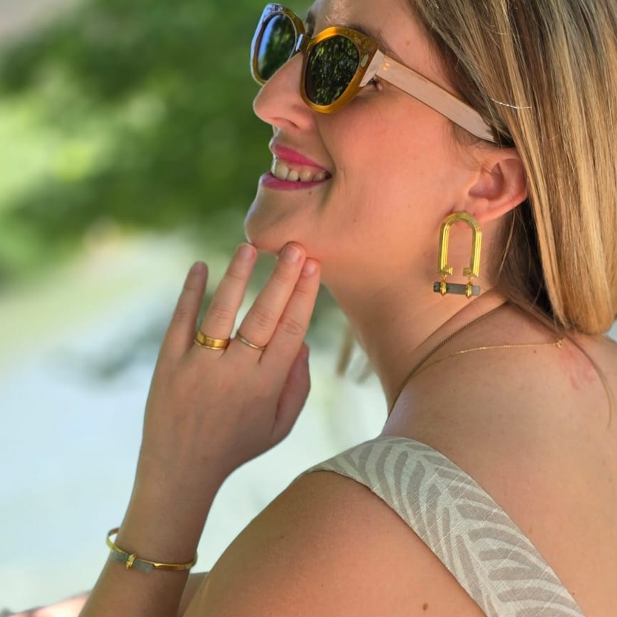 Slightly adjustable cuff holds a custom cut labradorite gemstone on top with stepped metal detail center. Handcrafted in Brass with 18k Gold plating.